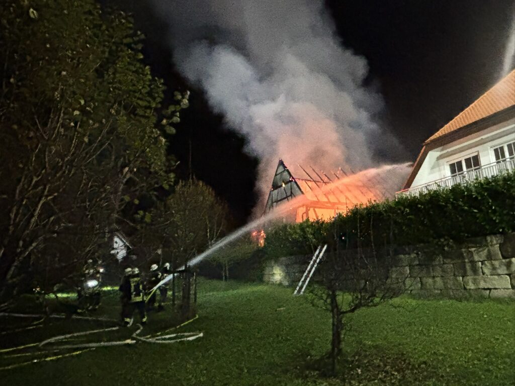In den frühen Morgenstunden am 3. Dezember kam es gegen 2 Uhr zu einem Brand eines Schuppens in der Riedlestraße in Neufrach (Gemeinde Salem, Bodenseekreis). Erste Kräfte der Freiwilligen Feuerwehr Salem wurden um 2:08 Uhr alarmiert und fanden das Lagergebäude, das sich wenige Meter hinter einem Wohnhaus befand, mit bestätigter Notrufmeldung stark und weithin sichtbar brennend vor.