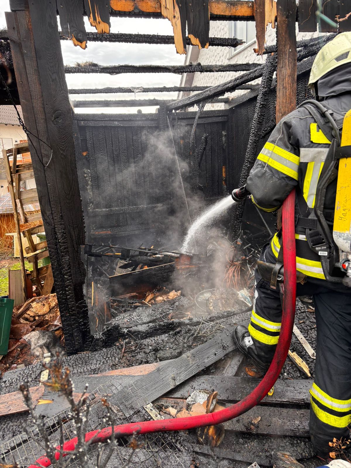 Die ersten Einsatzkräfte trafen gegen 15:00 Uhr an der Einsatzstelle ein. Vor Ort stand ein Abstellschopf aus Holz bereits im Vollbrand. Aufgrund der sehr geringen Entfernung zu einem angrenzenden Wohngebäude hatten die Flammen dieses bereits erreicht. Es bestand akute Gefahr eines Übergreifens auf den Dachstuhl des Wohngebäudes. Einsatzverlauf und Maßnahmen Umgehend wurde ein schneller Löschangriff eingeleitet, um eine weitere Ausbreitung des Feuers zu verhindern. Die Wasserversorgung erfolgte über einen Hydranten.