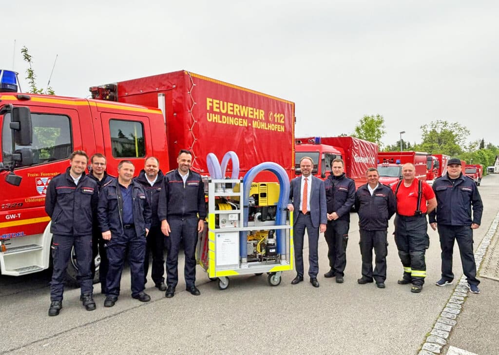Die Feuerwehren in Friedrichshafen, Überlingen, Uhldingen-Mühlhofen, Salem, Oberteuringen, Meckenbeuren und Kressbronn können die Pumpen ab sofort bei ihren Einsätzen verwenden. Christoph Keckeisen, Erster Landesbeamter, und Kreisbrandmeister Alexander Amann übergaben das Material am Mittwoch, 7. Mai 2025 an Vertreter der Wehren. “Nach der Erfahrung mit Hochwasser- und Überflutungsereignissen in den letzten Jahren, hatte der Kreistag beschlossen, besonders geforderte Feuerwehren mit weiteren Pumpen auszustatten”, so Keckeisen, der als Dezernent im Landratsamt auch für den Bevölkerungsschutz und das Feuerwehrwesen verantwortlich ist. Das Hochwasserereignis beispielsweise im vergangenen Frühjahr habe deutlich gezeigt, dass das persönliche Engagement der Einsatzkräfte sehr hoch sei. Das wolle der Kreis durch gute Ausrüstung unterstützen und ergänzen.