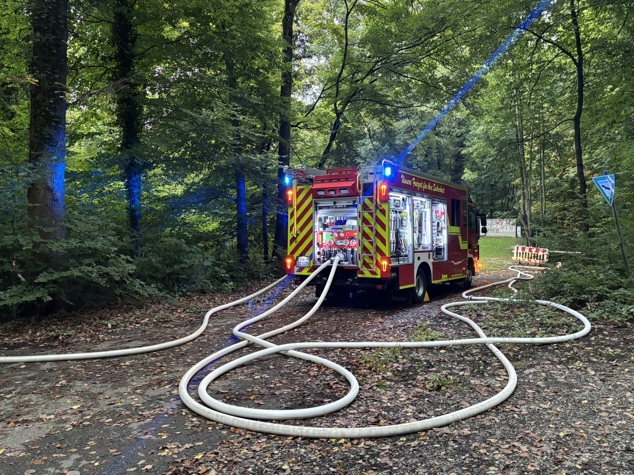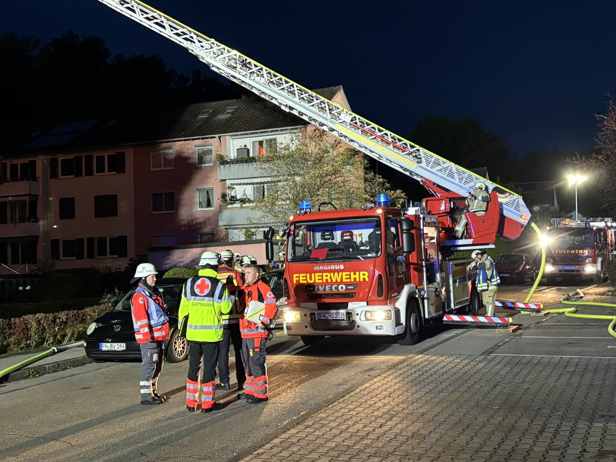 Die um 6.12 Uhr alarmierte Freiwillige Feuerwehr Meersburg erkannte schnell, dass sich das Feuer schon in den Dachstuhl ausgedehnt hatte und ließ weitere Kräfte nachfordern. Mit dieser Erhöhung des Alarmstichworts und den Nachalarmierungen rückten weitere Einsatzkräfte aus dem Gemeindeverwaltungsverband an, so die gemeinsame Führungsgruppe und Löschfahrzeuge der Gemeinden Hagnau, Immenstaad, Stetten und Daisendorf. Aus Markdorf kam der Gerätewagen Atemschutz mit Atemschutzgeräteträgern und von der Uhldingen-Mühlhofen eine zweite Drehleiter dazu.