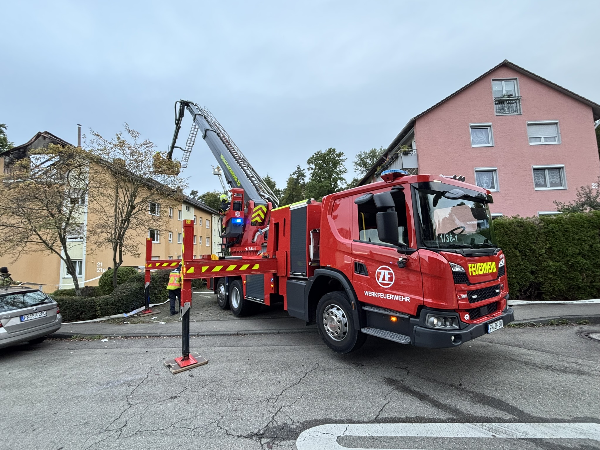 Zur Unterstützung der Löscharbeiten kam auch der Gelenkmast der Werkfeuerwehr ZF zum Einsatz, mit dem die betroffene Dachfläche überall erreicht werden konnte.