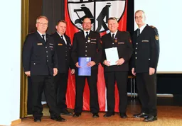 Mit der Ehrenmedaille des Landesfeuerwehrverbands in Silber konnte Brandmeister Damian Krämer (Feuerwehr Friedrichshafen-Kluftern) ausgezeichnet werden. Oberbrandmeister Martin Klar, Abteilungskommandant der Abteilung FN-Kluftern, wurde das deutsche Feuerwehr-Ehrenkreuz in Bronze verliehen. Vorsitzender Martin Schweitzer zitierte die langen Listen der Tätigkeiten der beiden verdienten Friedrichshafener Feuerwehrleute bevor der Vizepräsident des LFV, Klaus Merz, ihnen die hohen Auszeichnungen an das Revers heften konnte. Sie seien ein Vorbild für die Jugend, sagte Merz.
