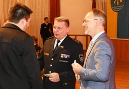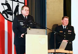 Polizeipräsident Uwe Stürmer ließ es sich wenige Tage vor seinem Ruhestand nicht nehmen, der Versammlung beizuwohnen und den Feuerwehren im Landkreis in seinem Grußwort seinen Dank für die stets konstruktive Zusammenarbeit auszudrücken. Das sehr professionelle und kameradschaftliche Miteinander von Polizei und Feuerwehren trage immer zum Einsatzerfolg bei. Stürmer bekam vom Vorsitzenden Martin Schweitzer die silberne Ehrennadel des KFV überreicht, als Dank für diese gute Zusammenarbeit.